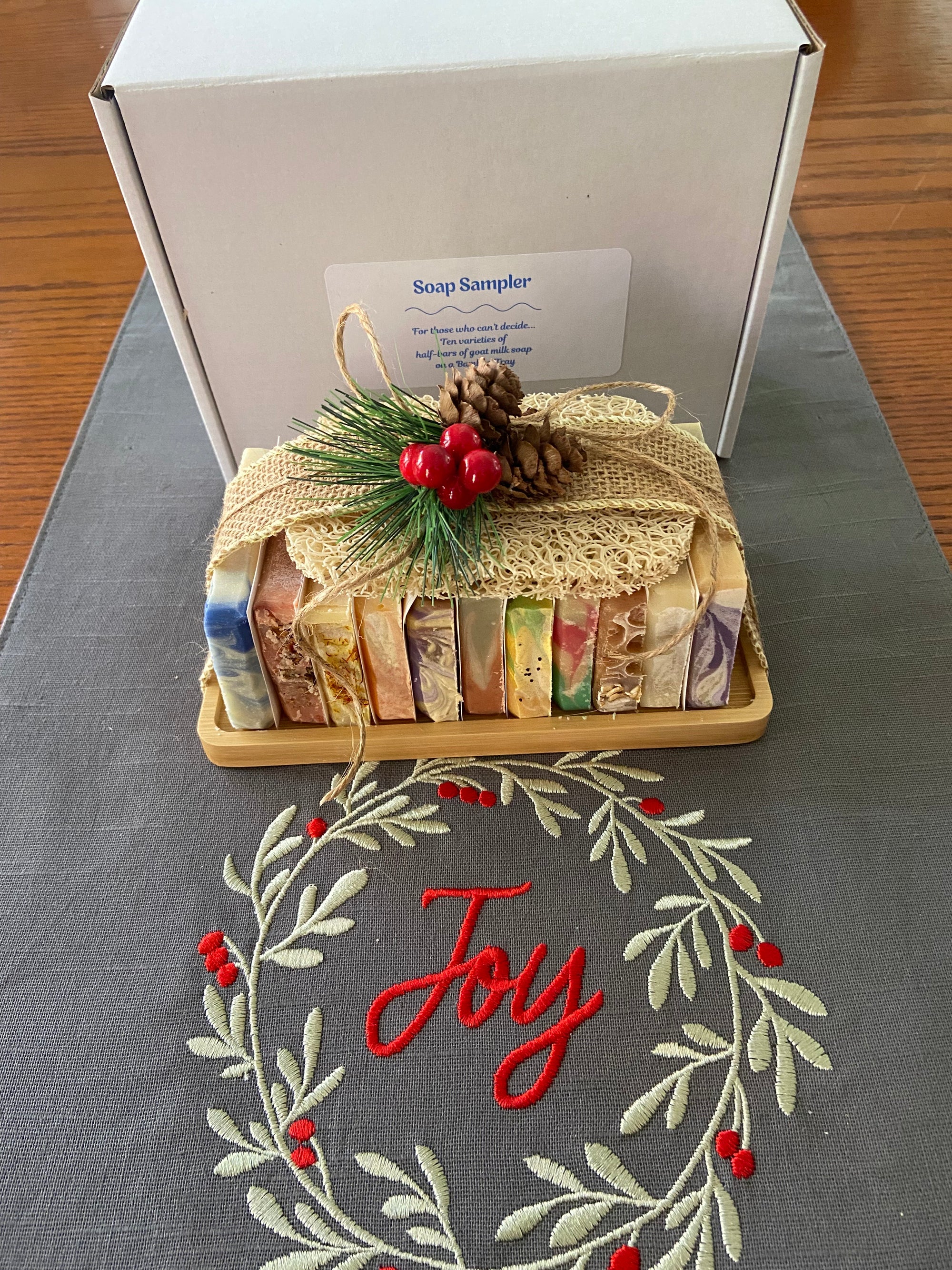 This bamboo tray holds 11 half bars of each of my fabulous goat milk soaps. Comes with a soap saver. Sample them all and come back for the big bars of your favorites. Cards included which have names and ingredients listed.